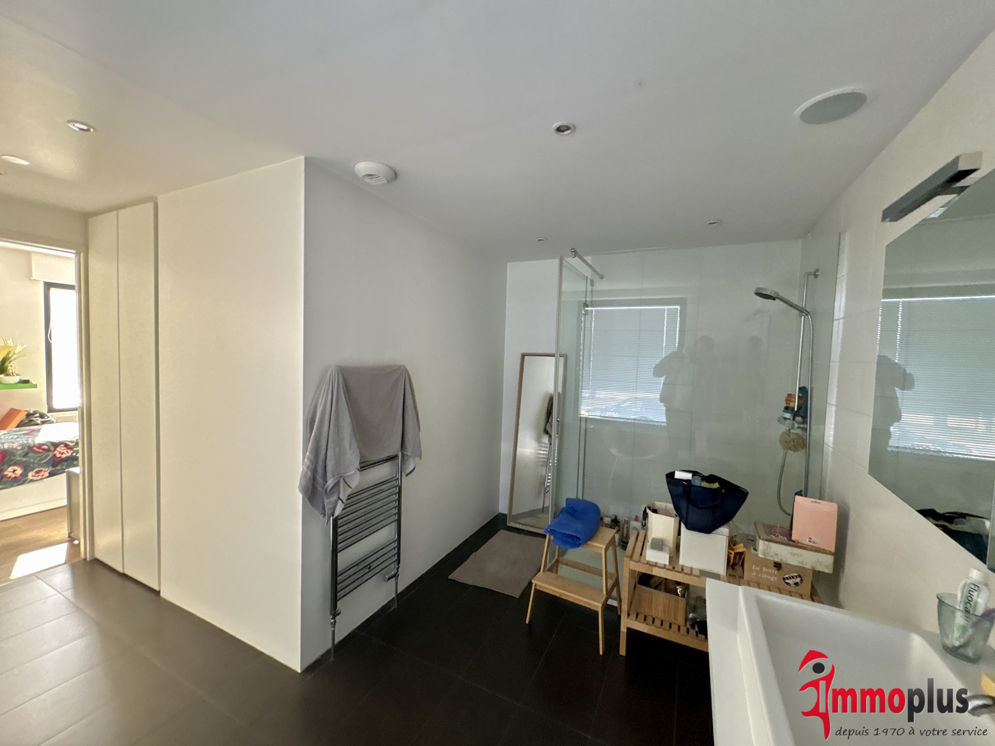 Le rez-de-chaussée propose également une belle suite comprenant une chambre à coucher avec son couloir d’armoires murales sur mesure menant à une élégante salle d’eau privative avec douche à l’italienne, ainsi qu’un WC indépendant.