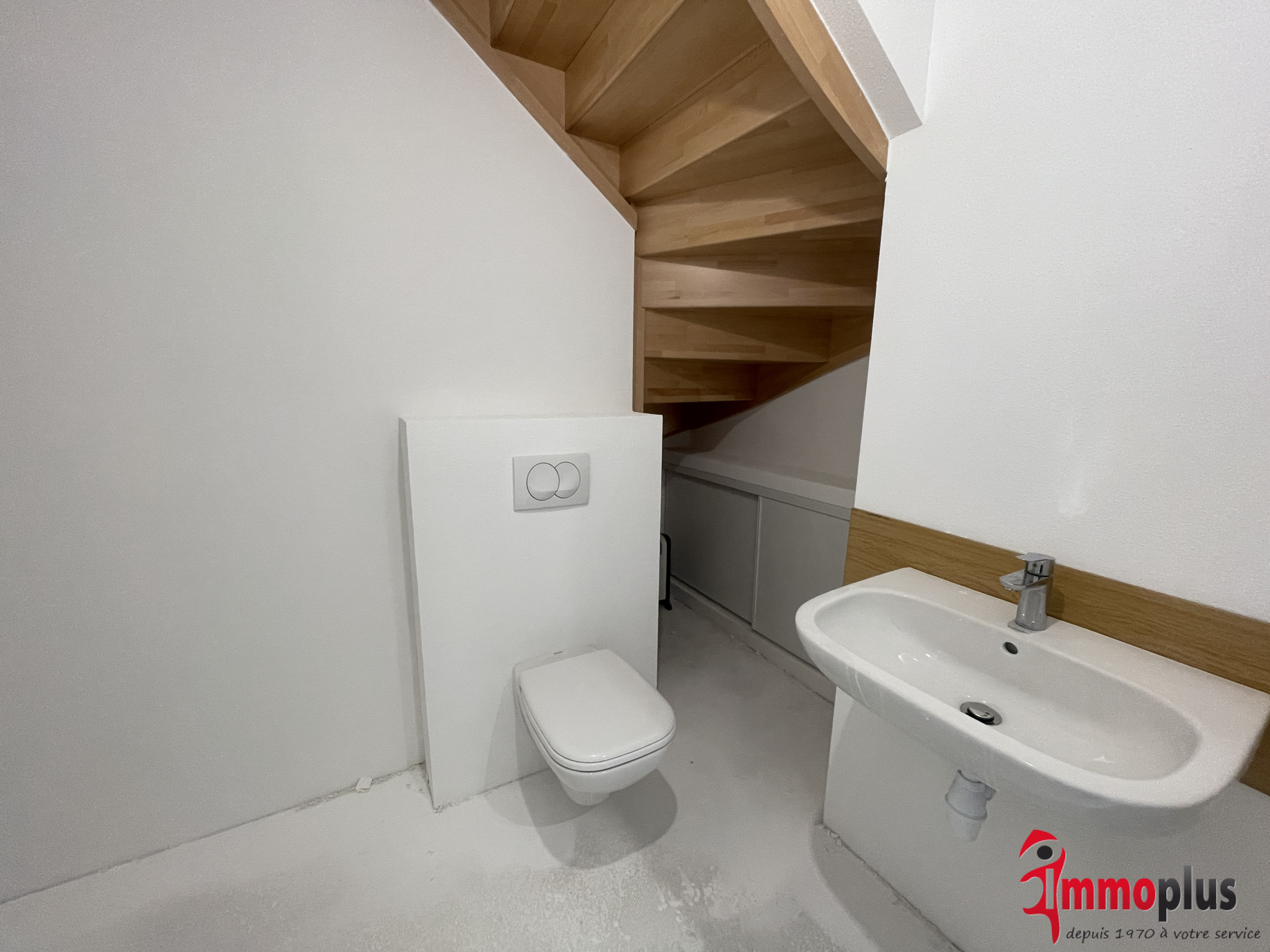 Le rez-de-chaussée se compose d’une entrée, d’un vaste séjour lumineux avec cuisine ouverte qui comprendra four, plaque de cuisson et hotte, le tout donnant accès à une grande terrasse de 11 m² et à son jardin de 80 m² (exposition ouest), clos et engazonné, ainsi qu’un WC indépendant avec espace buanderie.