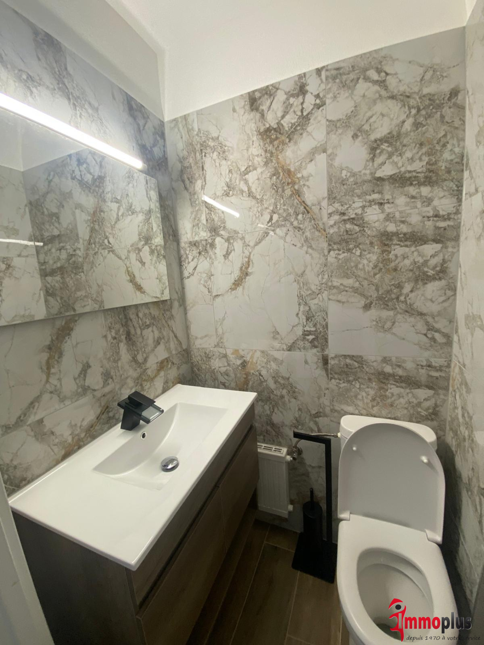 Ce studio est composé d'une pièce de vie, une kitchenette et d'une salle de bain équipée d'un meuble vasque, une douche et un toilette.